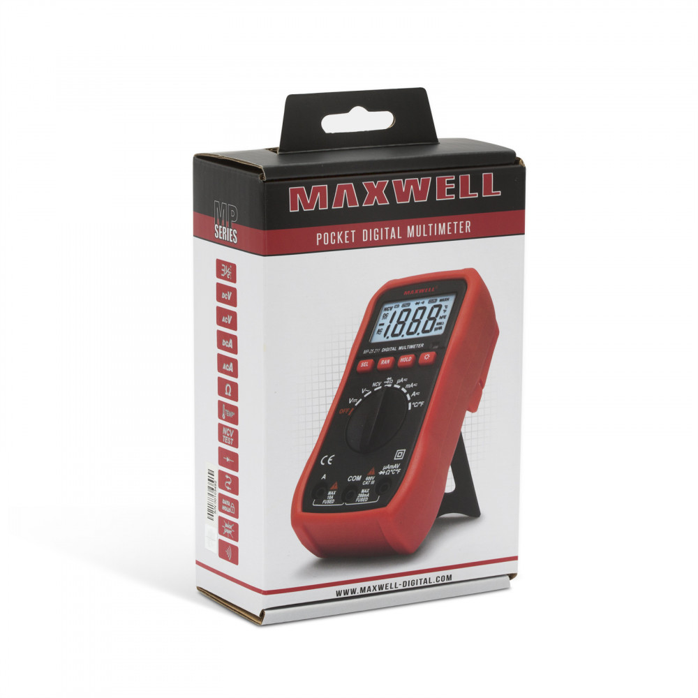 A Maxwell műszerek új MP sorozata a kompakt méretű műszerek kategóriáját erősíti. Alapfunkcióin kívül háttérvilágítással, érintés nélküli feszültség kereséssel és automata méréshatár váltással van ellátva a könnyebb használat érdekében. Strapabíró készülékháza biztosítja a probléma mentes használatot minden körülmények között.