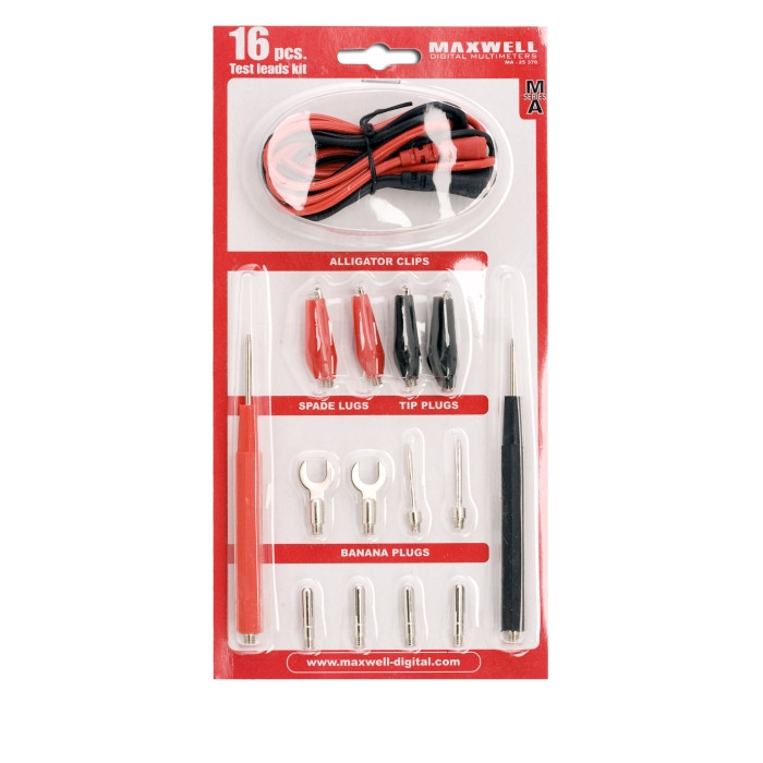 - 2 db mérővezetéket tartalmaz, melynek egyik vége banándugó, a másikhoz pedig csavarosan rögzíthetőek a tartozékok